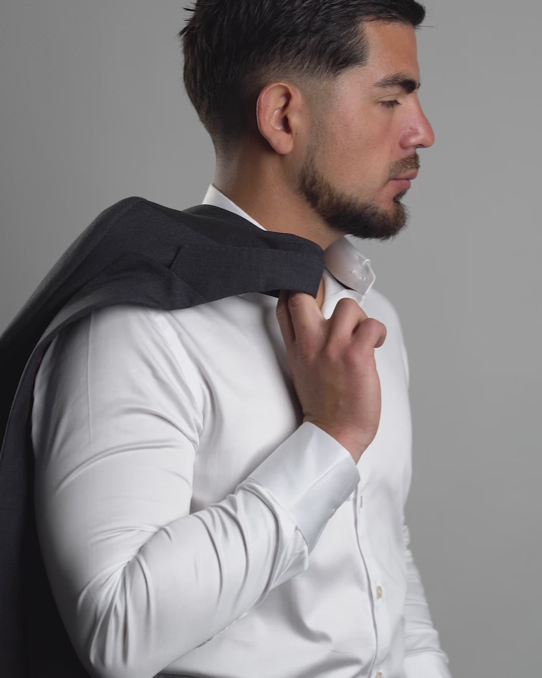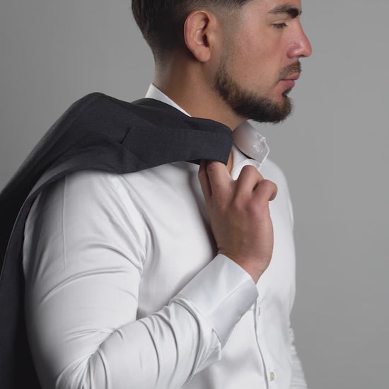 La camisa blanca de algodón stretch es una prenda elegante y cómoda, confeccionada con una mezcla de 97% algodón pima peruano y 3% elastano.